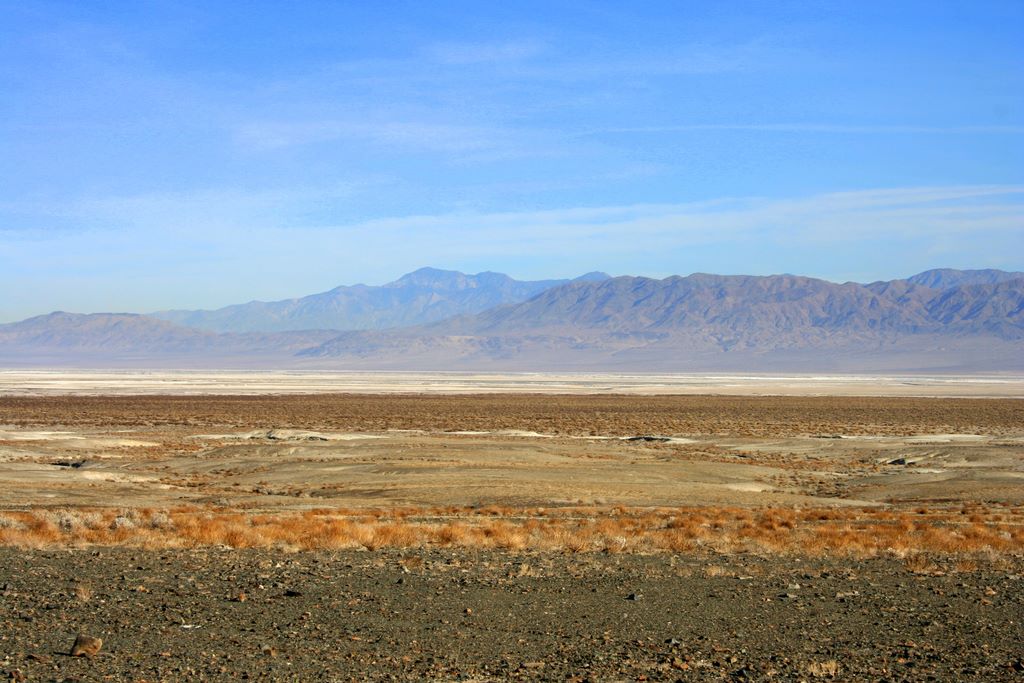 This is the Trona salt lake flats looking south towards the Panamint Mountains. In the far distance you can see Telescope Peak, the highest point in Death Valley.